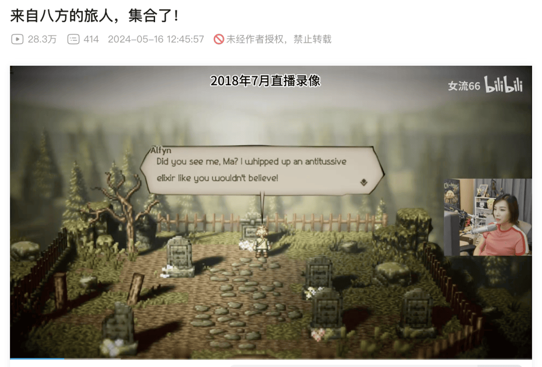 你聊市場投入,這項目的力度也是一點也不小:這幫人又去做線上音樂區的宣發;又和主機圈的KOL女流做合作——2018年7月,女流就曾做過《歧路旅人》主線任務的實況視頻,讓很多人入坑成了IP粉絲。