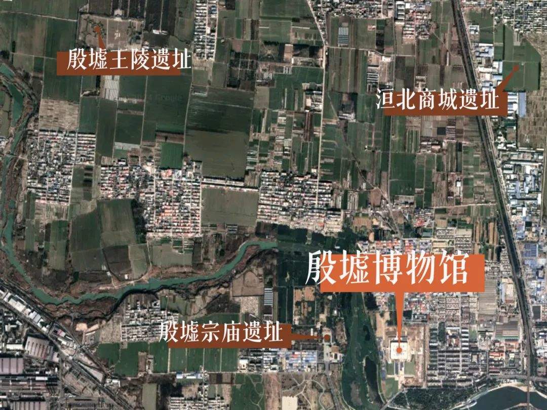 殷墟遺址位於安陽市北郊,橫跨洹水兩岸。人們曾經認為,殷墟的總面積在36平方公里左右,包括洹水以南的小屯一帶的宮殿宗廟區、侯家莊西北岡王陵區以及商代中期的洹北商城。