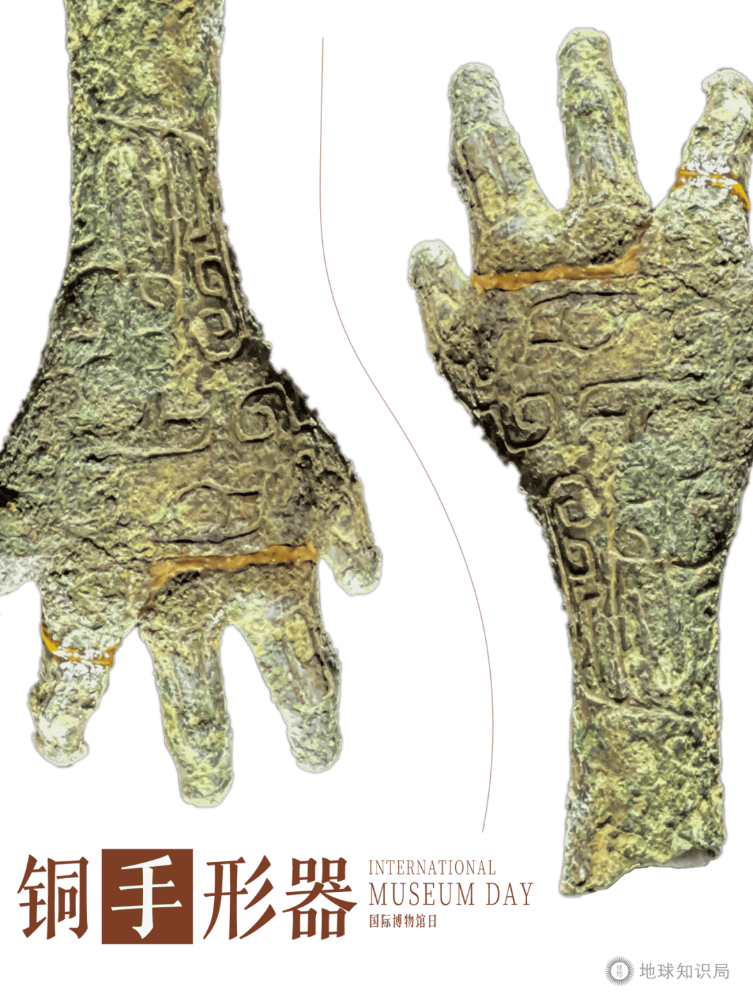 亞長墓還出土了一件令人費解的文物——銅手。這是一隻右手,比一般成人手略小,造型非常逼真,關節清晰,指尖圓滑,指甲微露,手腕截面內部殘留有碳化的木柄。