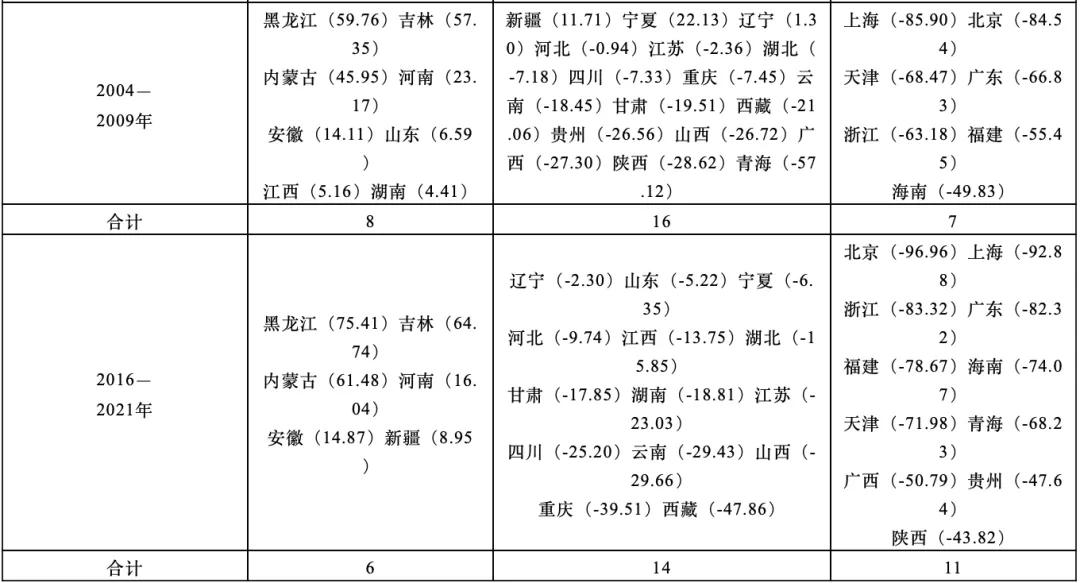 **一是糧食主產區的邊界呈現北移趨勢。**中國糧食生產區域由南方持續向北方轉移,主產區邊界逐步北移。東南沿海地區的江蘇和浙江、西南地區的四川、長江中游的江西、湖南和湖北等省份在1980—1985年還屬於糧食主產區,到2016—2021年均已成為糧食調入省份,其中浙江已經成為糧食主銷區,糧食調入率高達83.32%。當前中國糧食主產區主要集中在東北和黃淮海地區,糧食主產區邊界呈現出明顯的北移趨勢。