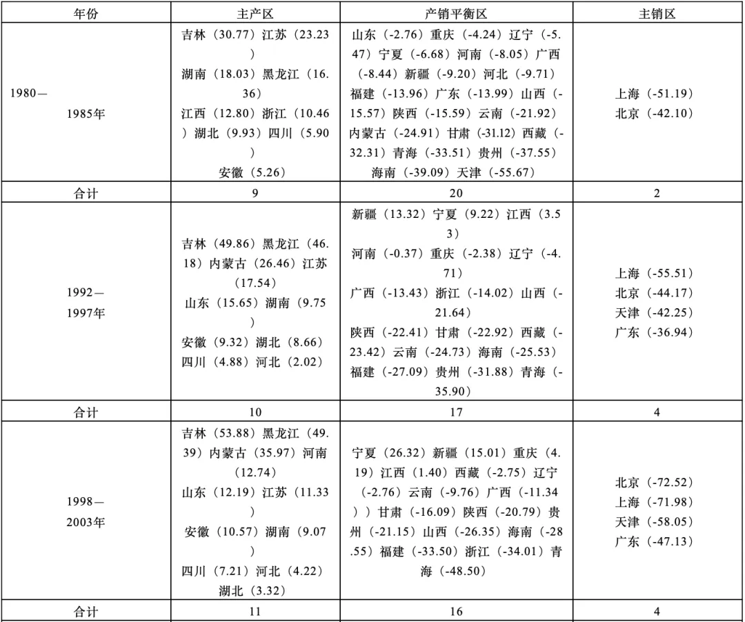 2003年之前,中國政府對糧食主產區、主銷區和產銷平衡區的界定處於動態調整階段。1994年,在《國務院關於深化糧食購銷體制改革的通知》中,明確北京、天津、上海、廣東、福建、海南等為糧食主銷區。同年,在《國務院批轉財政部等部門關於糧食政策性財務掛帳停息報告的通知》中,依據1992年、1993年全國平均人均糧食產量確定了11個糧食主產省,分別為遼寧、吉林、黑龍江、江蘇、浙江、安徽、江西、山東、湖北、湖南、四川。2001年,在《國務院關於進一步深化糧食流通體制改革的意見》中,明確經濟相對比較發達的浙江、上海、福建、廣東、海南、江蘇、北京、天津等地區可以放開糧食收購,同時提出糧食主產和主銷區以外的地區為糧食產銷大體平衡的省(區)的概念。此次糧食流通體制改革,根據各省份糧食生產和消費的總體特徵,綜合考慮資源稟賦差異和糧食生產歷史傳統,將全國31個省(區、市)劃分為13個糧食主產區、7個糧食主銷區和11個糧食產銷平衡區。自此,主產區、主銷區和平衡區的格局正式確立並延續至今。