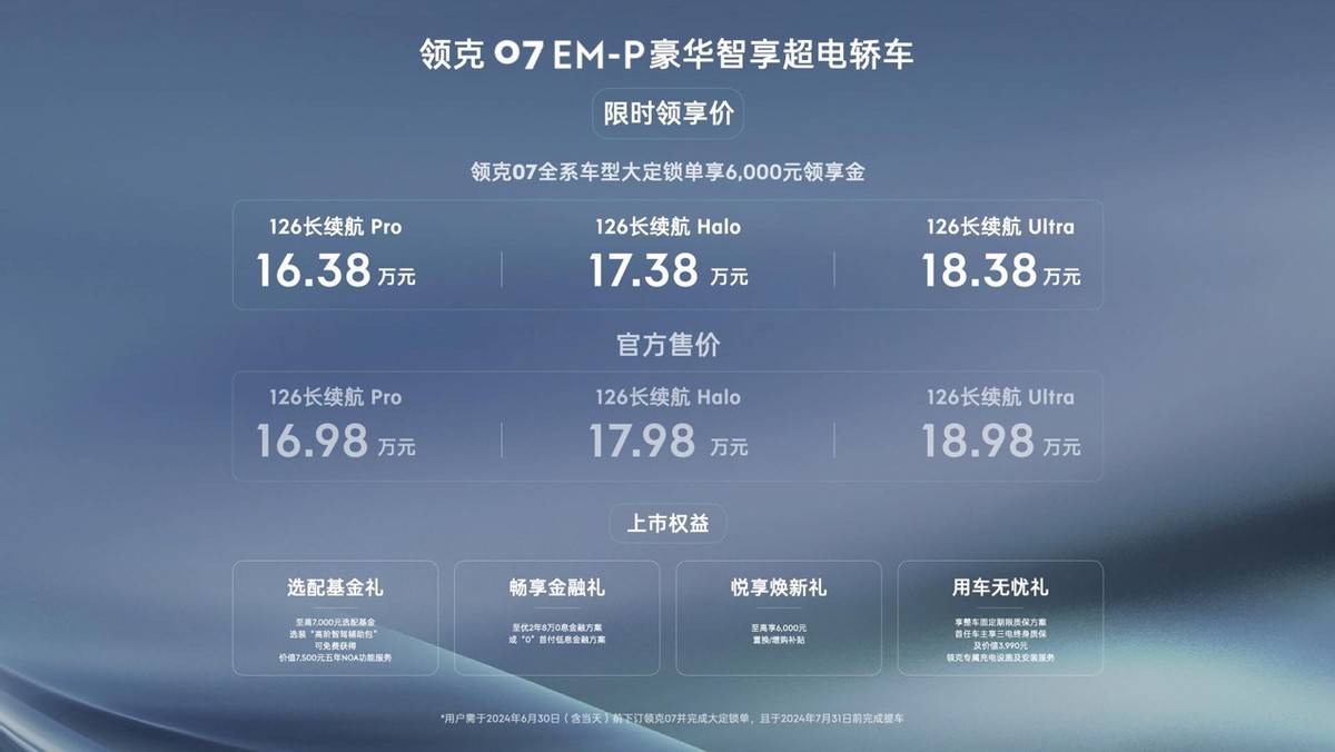新車指導價為16.98萬元-18.98萬元,共帶來126長續航Pro、126長續航Halo、126長續航Ultra三款車型。同時,領克還為前期購買用户提供了一系列優惠,6月30日前下單、7月31日前提車,即可享受3萬元“上市權益”。