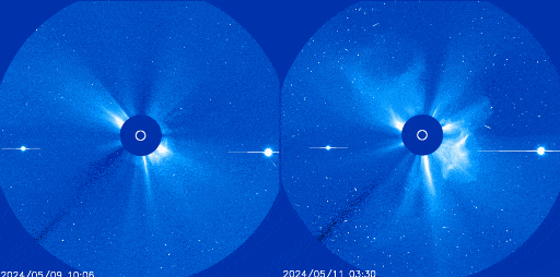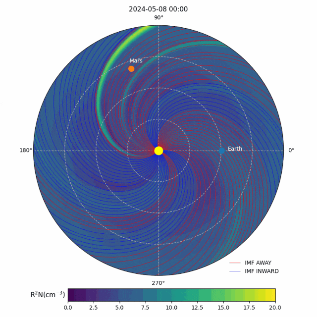 5月10日開始,活動區AR3664爆發的多個全暈日冕物質拋射(CME)陸續到達地球,引發強烈地磁擾動,發生特大地磁暴事件。