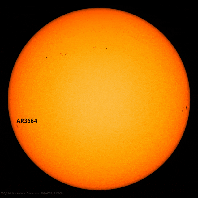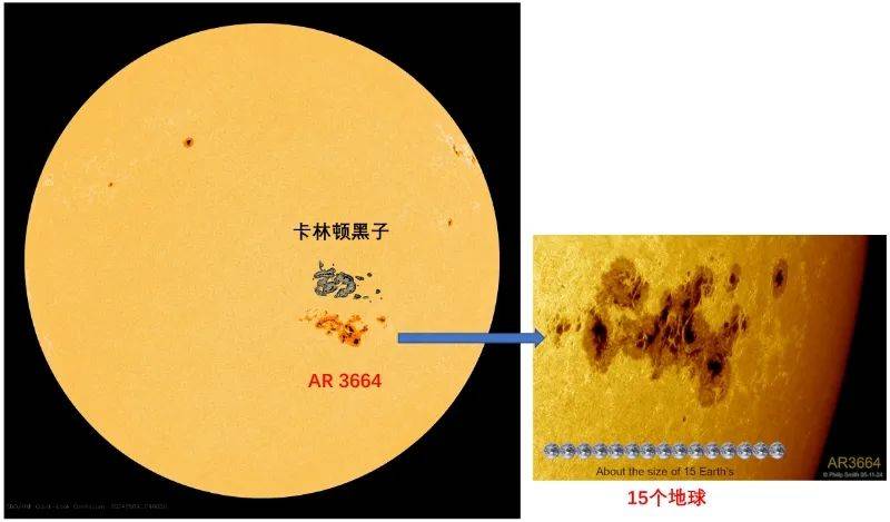 前文提到的AR3664是太陽表面一個巨大的太陽黑子羣,東西跨度近似15個地球排成排。曾有科學家拿它和歷史排名No.1的超級卡林頓太陽風暴中的太陽黑子進行對比,絲毫也不遜色,這足以載入史冊了。