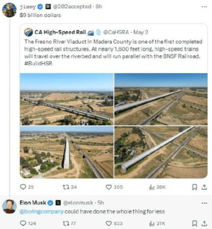 當然這還不是辦事最不利索的例子。5月初,“加州高鐵”在“X”平台上發佈消息“馬德拉縣的弗雷斯諾河高架橋是首批建成的高速鐵路結構之一。長近1600英尺,高速列車將在河牀上行駛,並與BNSF鐵路平行運行。”