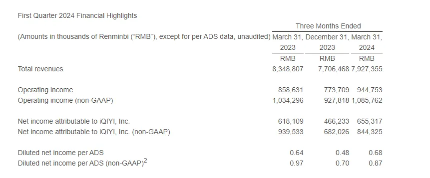 北京時間5月16日晚,愛奇藝發佈了截止2024年3月31日未經審計的第一季度財報。