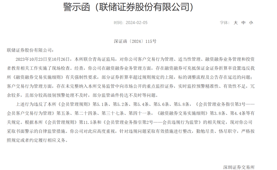 2023年12月,中國證券業協會公佈2023年證券公司債券業務執業質量評價結果,聯儲證券評級結果由B降為C。今年2月5日,聯儲證券又因融資融券業務管理違規被深交所出具警示函。