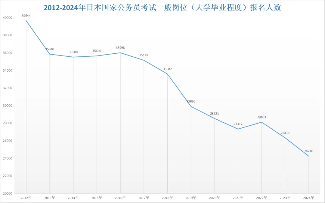 近日,日本人事院公佈數據,2024年度日本國家公務員考試一般崗位(大學畢業程度)的報考人數為24240人,比去年減少了7.9%,更是創下了2012年度採取現行考試以來的報考人數新低。