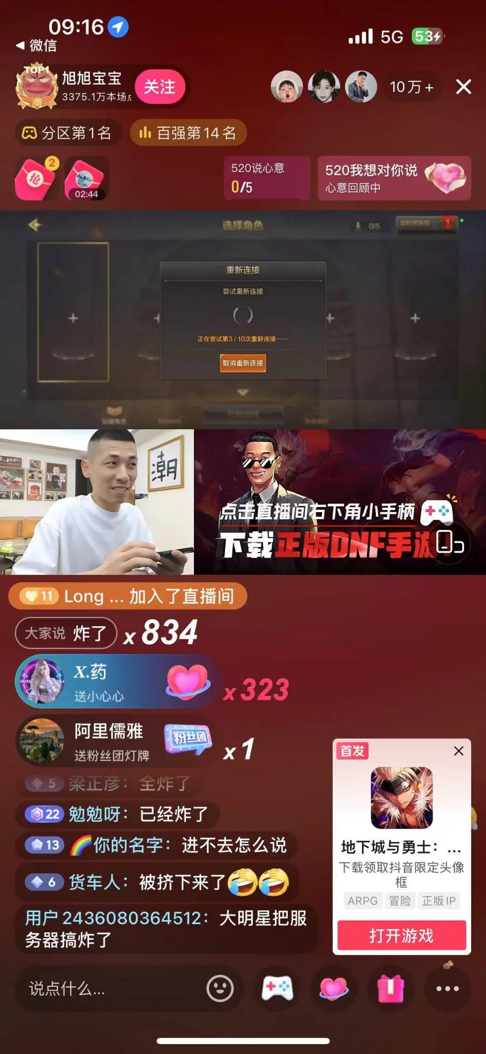 但意外還是不出意外地出現了。北京時間9點,DNF手遊服務器開放,一時間所有流量湧入,服務器承載能力有限,出現各種狀況,卡頓掉線、無法進入、長時間排隊,導致玩家怨聲載道。在直播間,許多大V面對如此多吐槽之聲被迫下播;在微博等社交媒體上,調侃謾罵也讓DNF長期在熱搜上掛着。