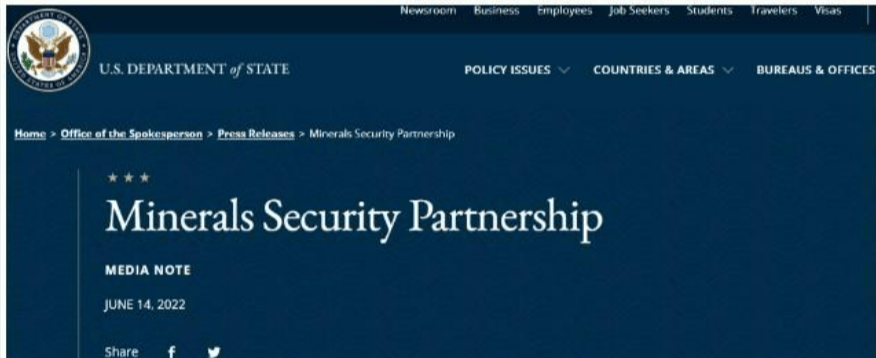 2022年6月加拿大勘探者和開發商協會會議期間,美國宣佈與加拿大、澳大利亞、法國、德國、英國、歐盟、日本、韓國等盟友建立“礦產安全夥伴關係”來協調內部關鍵礦產供應鏈的矛盾。同年12月聯合國《生物多樣性公約》第十五次締約方大會期間,美國、加拿大、澳大利亞、法國、德國、英國、日本又組建“可持續關鍵礦產聯盟”作為“礦產安全夥伴關係”的補充。