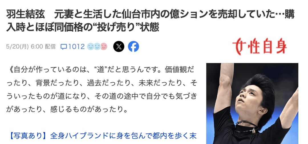 看來雙方都在努力拋棄過去,重新出發向前看。令人意外的是,日本網友對於羽生結弦拋售婚房這條新聞的評論視角卻非常特別。