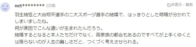 “羽生結弦和大谷翔平這兩名運動員的婚姻,分明是喜憂參半的選擇。是什麼原因導致了這樣的差別?這讓人覺得,人生的難處在於一旦結婚,不僅是本人,更是兩個家庭的結合,很難順利。”