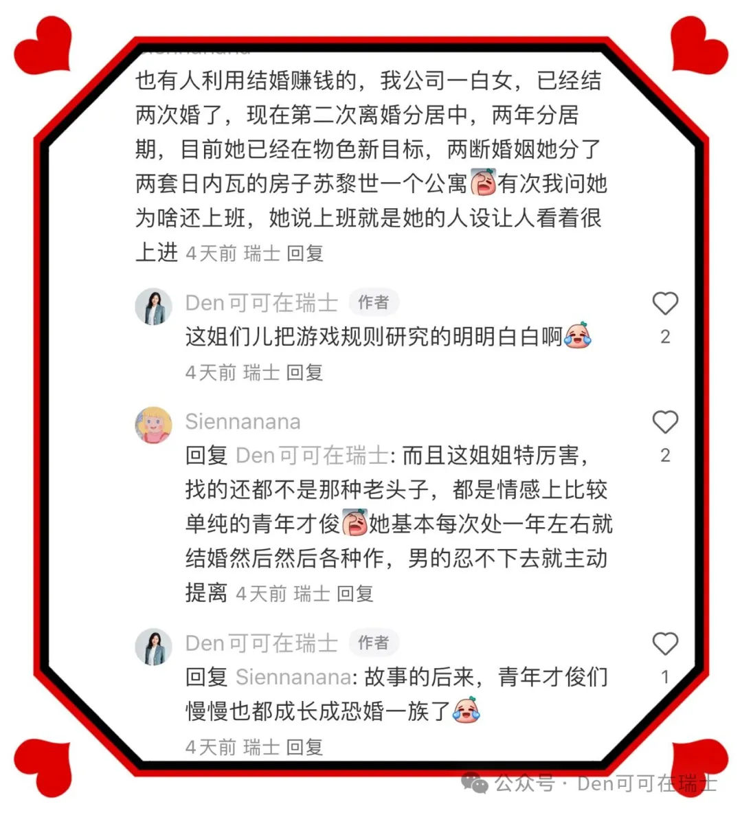 但是也有人反其道而行之用結婚賺錢的,比如小紅書上一位朋友分享的這位瑞士姐姐的操作: