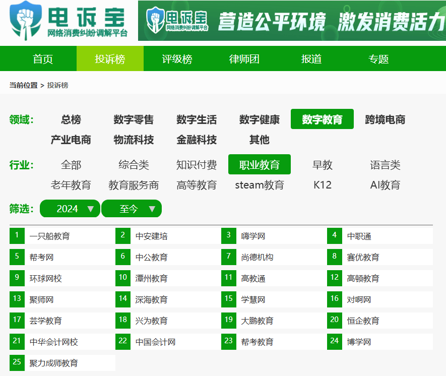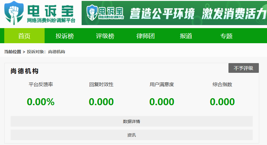 根據“電訴寶”2024年至今受理的職業教育領域用户有效投訴顯示(依據投訴量排行),尚德機構排名第七位,最新評級為“不予評級”。其他被投訴的類似平台依次為:一隻船教育、中安建培、嗨學網、中職通、幫考網、中公教育、賽優教育、潭州教育、高教通、高頓教育、聚師網、深海教育、學慧網、對啊網、芸學教育、大鵬教育、興為教育、恆企教育、博學網、聚力成師教育等。