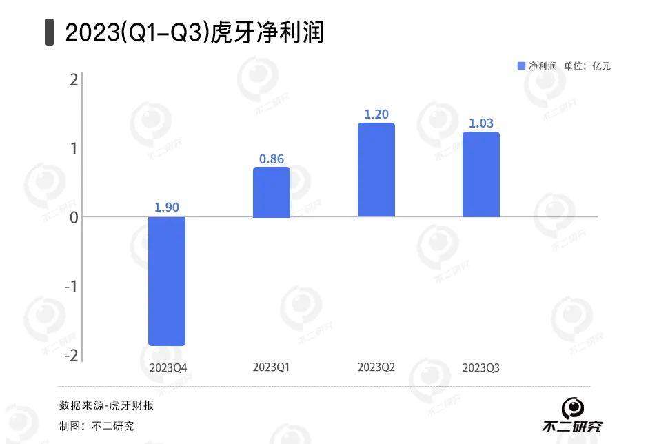 虎牙並不是每個季度都是盈利狀態。在非美國通用會計準則下,虎牙2023年四季度淨虧損1.9億元,2023年Q1-Q3,虎牙淨利潤分別是8550萬元、1.2億元、1.03億元。