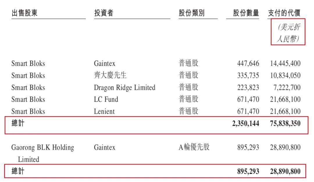 2024年4月,朱偉鬆通過全資持有的Smart Bloks分別向Gaintex、齊大慶、Dragon Ridge Limited、LC Fund及 Lenient進行了股權轉讓,合計轉讓235.01萬股,套現相當於人民幣7583.84萬元的美元。