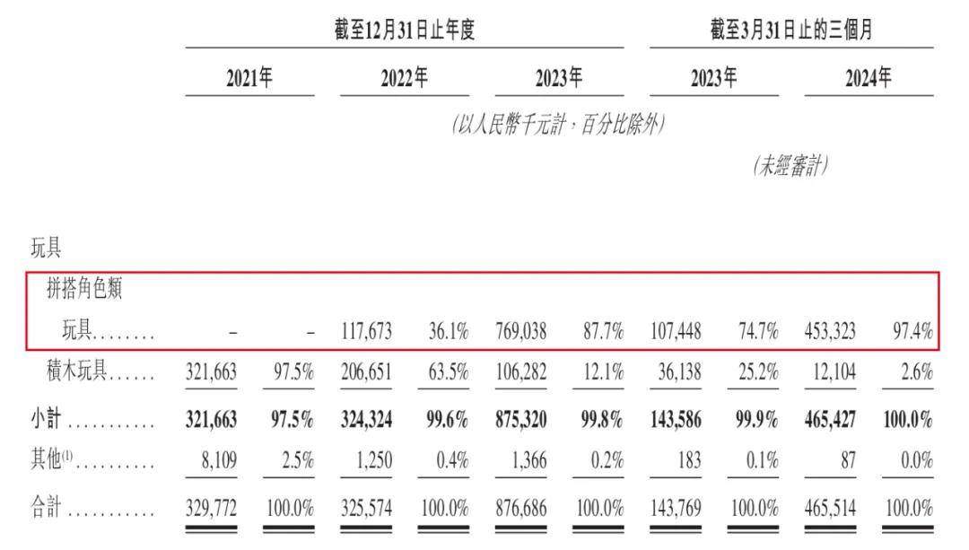 招股書顯示,2022年至2024年3月,來自拼搭角色類玩具的收入分別為1.18億元、7.69億元、4.53億元,佔比總收入的36.1%、87.7%、97.4%。