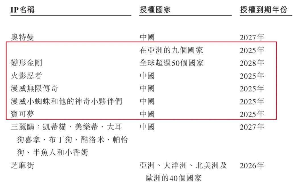 招股書顯示,對布魯可業績貢獻最大的奧特曼在中國的授權到期時間為2027年,但是在亞洲9個國家的授權到期日期為2025年。