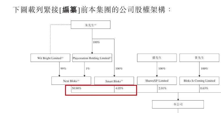 IPO前,朱偉鬆通過旗下公司,間接控制公司54.95%股權,朱偉松、Next Bloks、Smart Bloks、Wit Bright Limited及Playcreation Holding Limited共同為公司的控股股東。