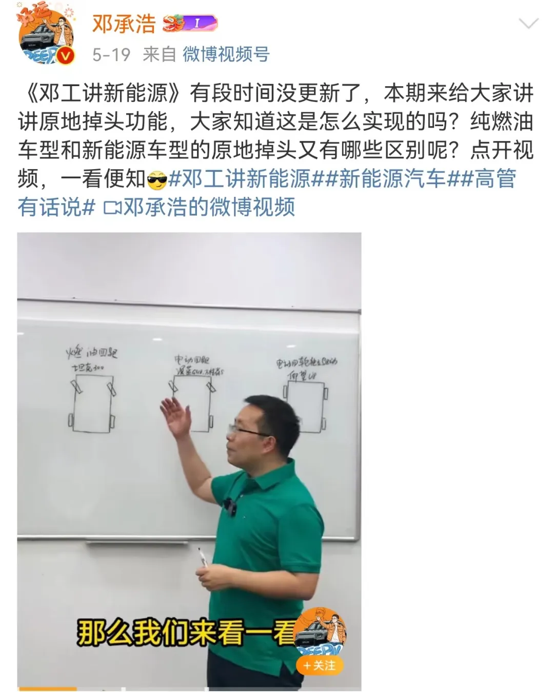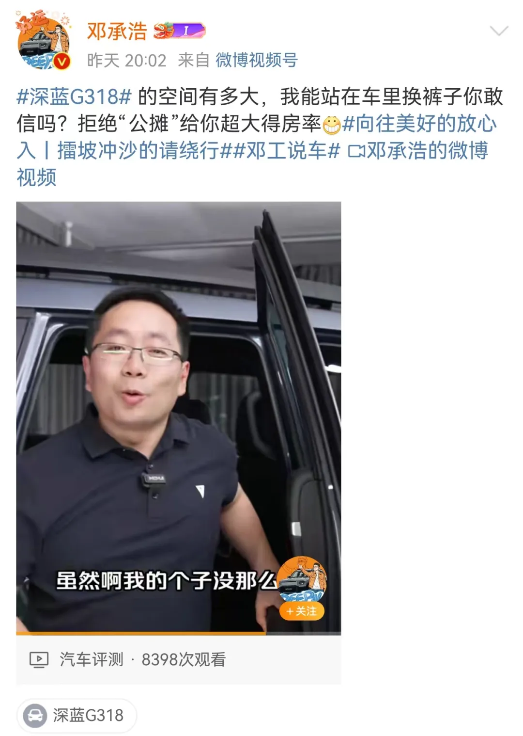 其中,深藍CEO鄧承浩雖然沒有開通短視頻賬號,但是他經常在微博上發佈短視頻。視頻風格頗有點“理工男”味道。