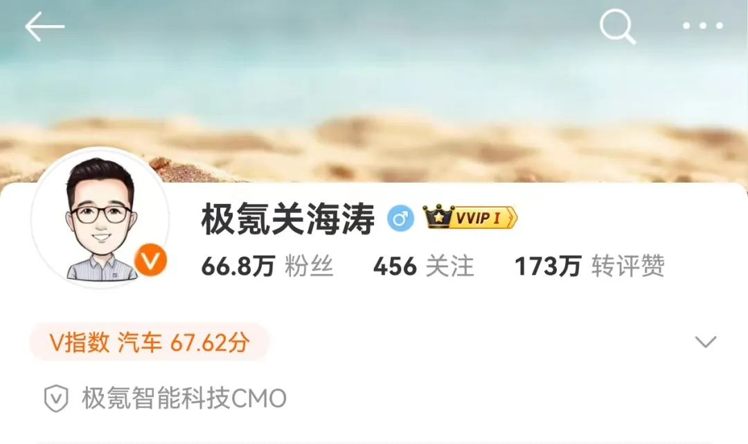 而極氪CMO關海濤微博粉絲66.8萬,獲得173萬轉評贊。