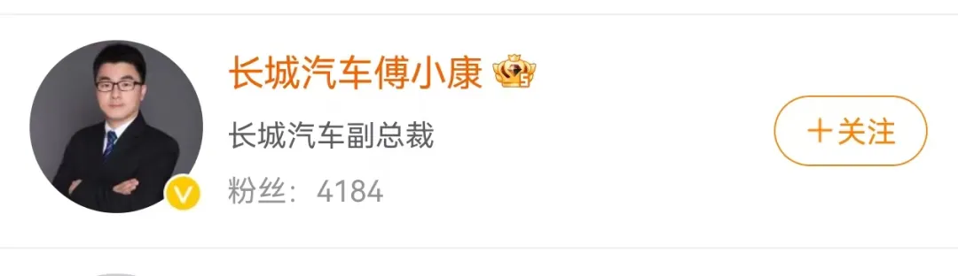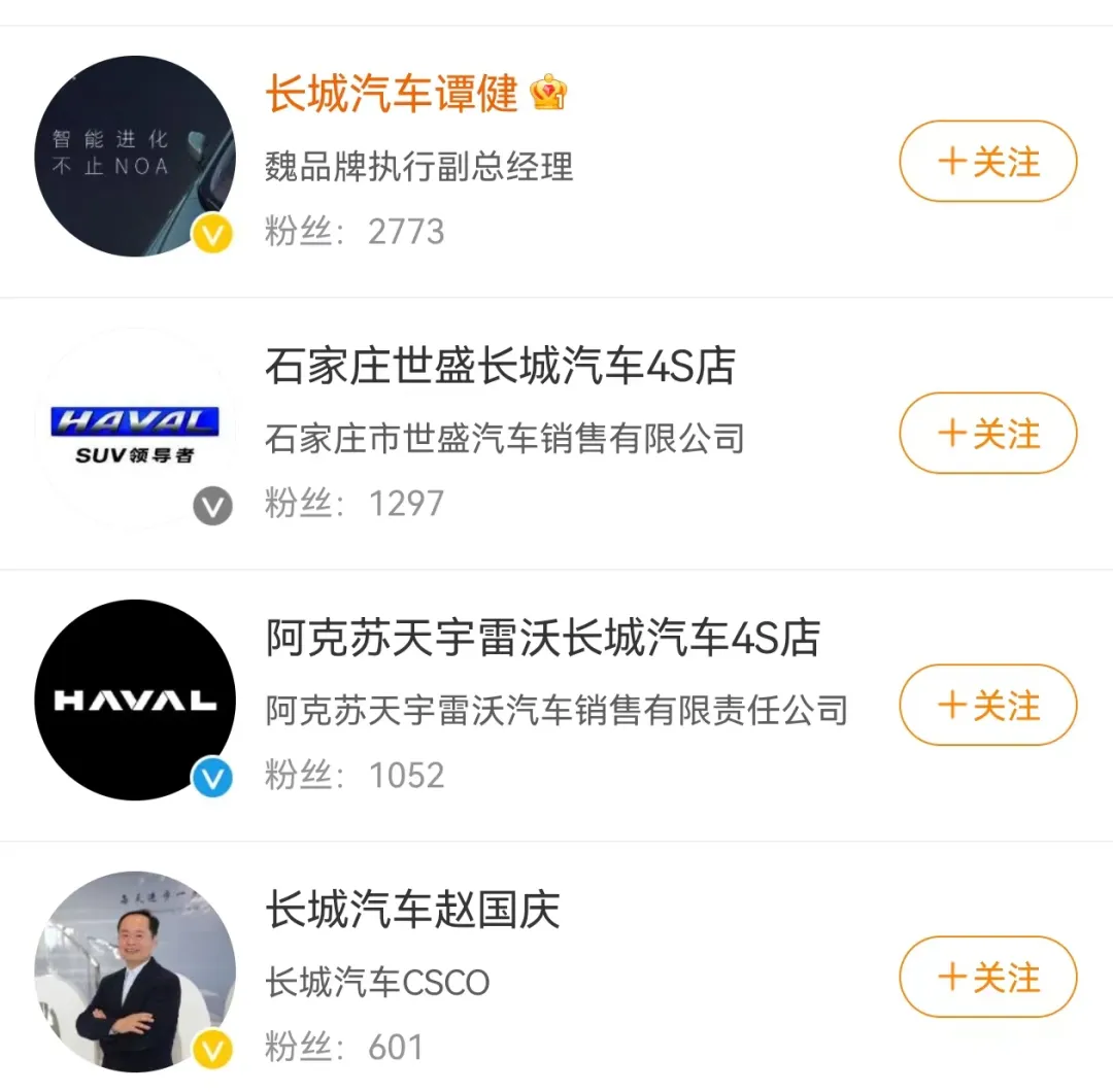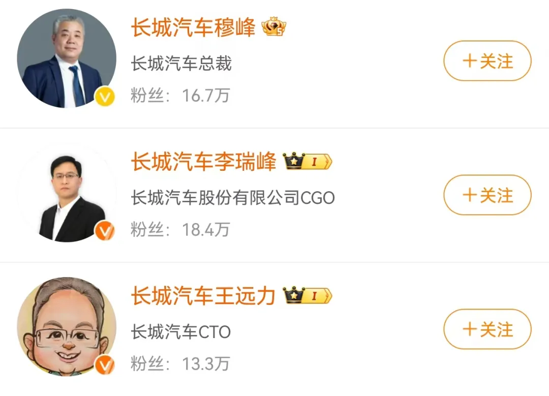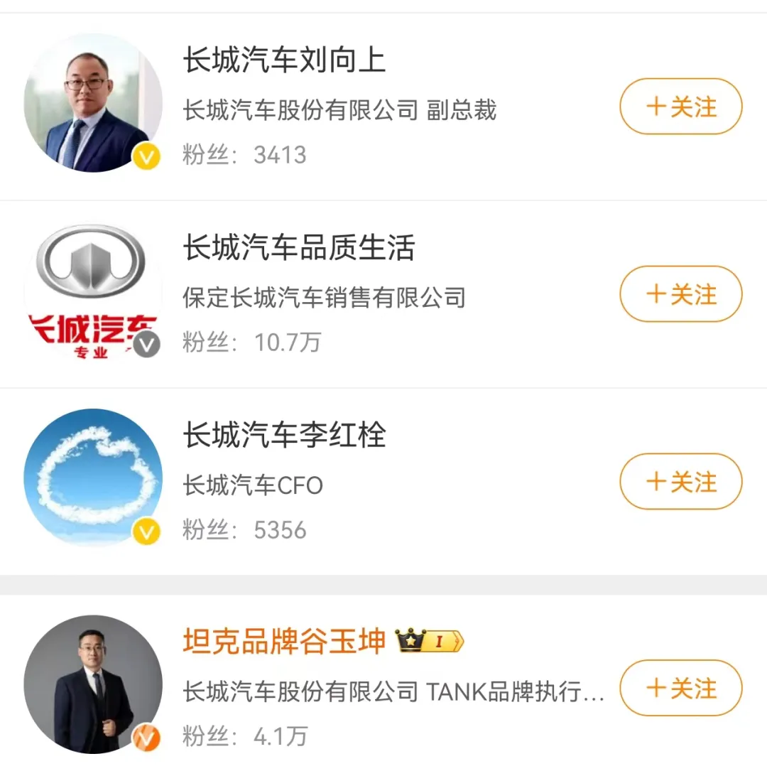 2023年6月13日,長城汽車要求所有高管入駐微博,長城汽車總裁穆峯、首席增長官李瑞峯、首席技術官王遠力、首席供應鏈官趙國慶首席財務官、李紅栓、副總裁傅小康以及五大品牌核心管理層等都開設微博賬號。