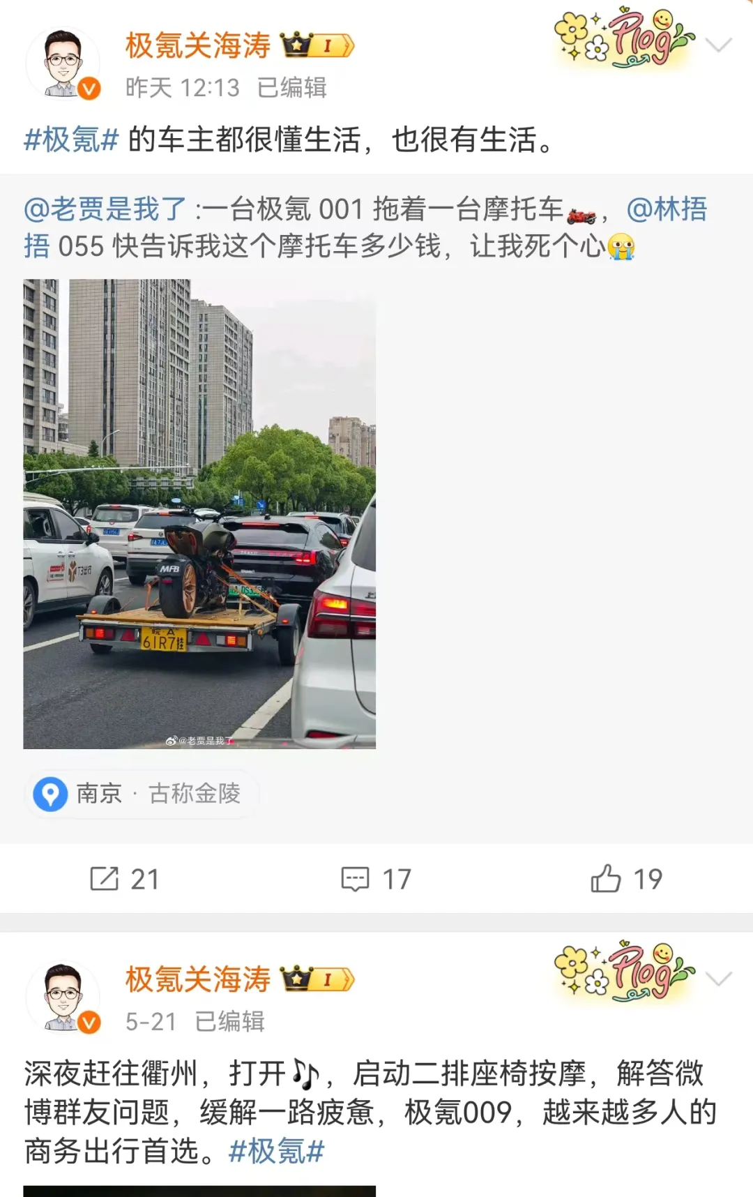 而極氪CMO關海濤的微博很“生活化”,雖然也多數以宣傳極氪為主,但是他的微博用詞並不“官方化”,基本上是以普通人發微博的方式描述產品以及相關事件。
