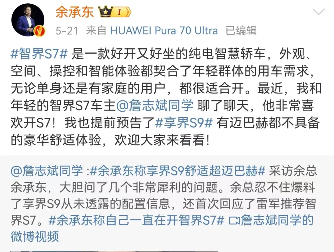 近期,餘承東的微博主要是宣傳與華為合作的各個汽車產品,例如問界、智界等產品。餘承東微博上也很喜歡用一些誇張形容詞來描述產品。比如“超強、最好、更強大、全新突破”等。
