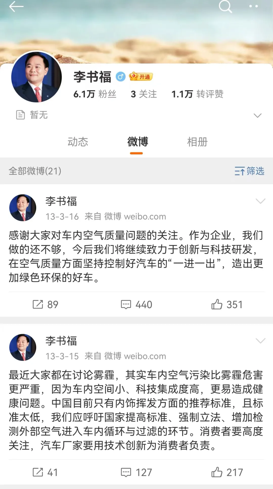 吉利李書福個人微博停更於2013年3月,而且該賬號甚至沒有黃V認證。