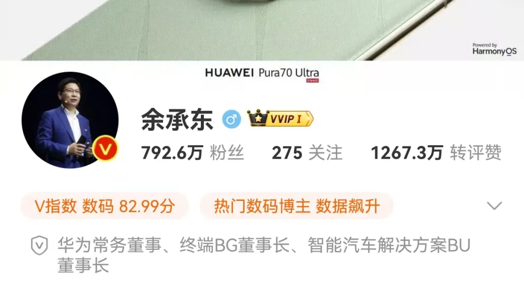 餘承東微博目前粉絲792.6萬,獲得1267.2萬轉評贊
