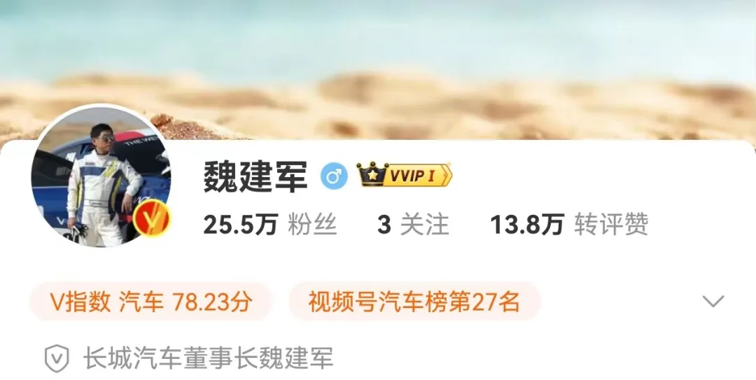 長城汽車創始人魏建軍目前抖音賬號粉絲47.2萬,獲贊119.9萬,共有19條作品;