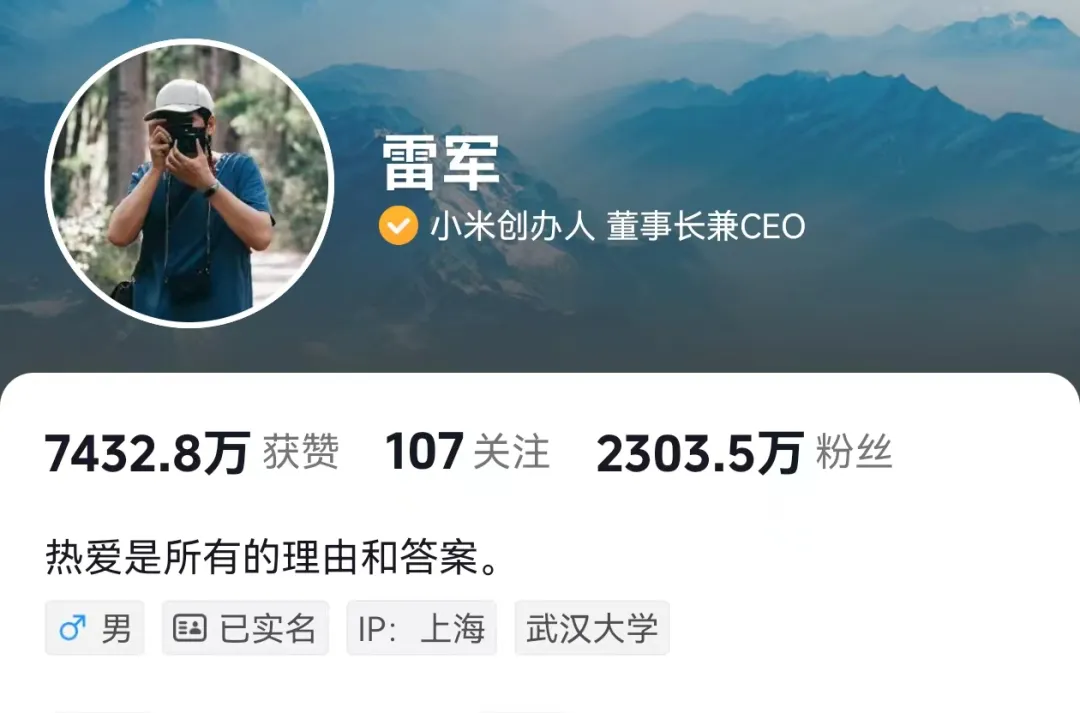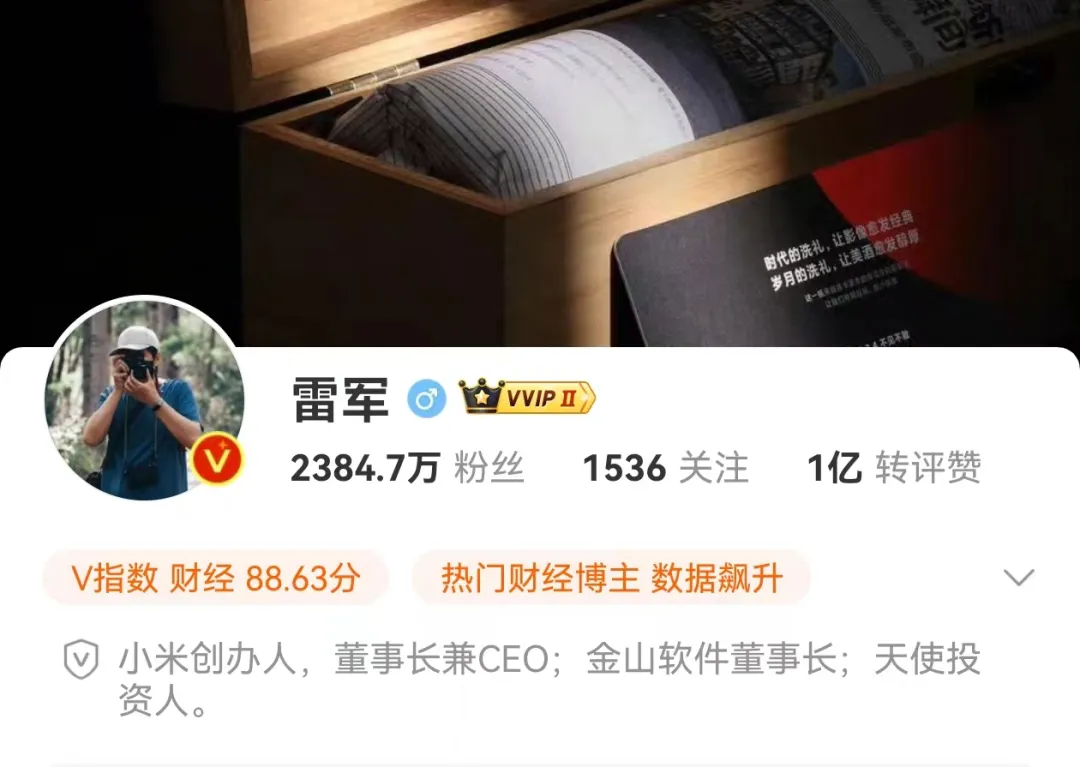 目前,雷軍微博擁有2384.7萬粉絲,獲得1億轉評贊。