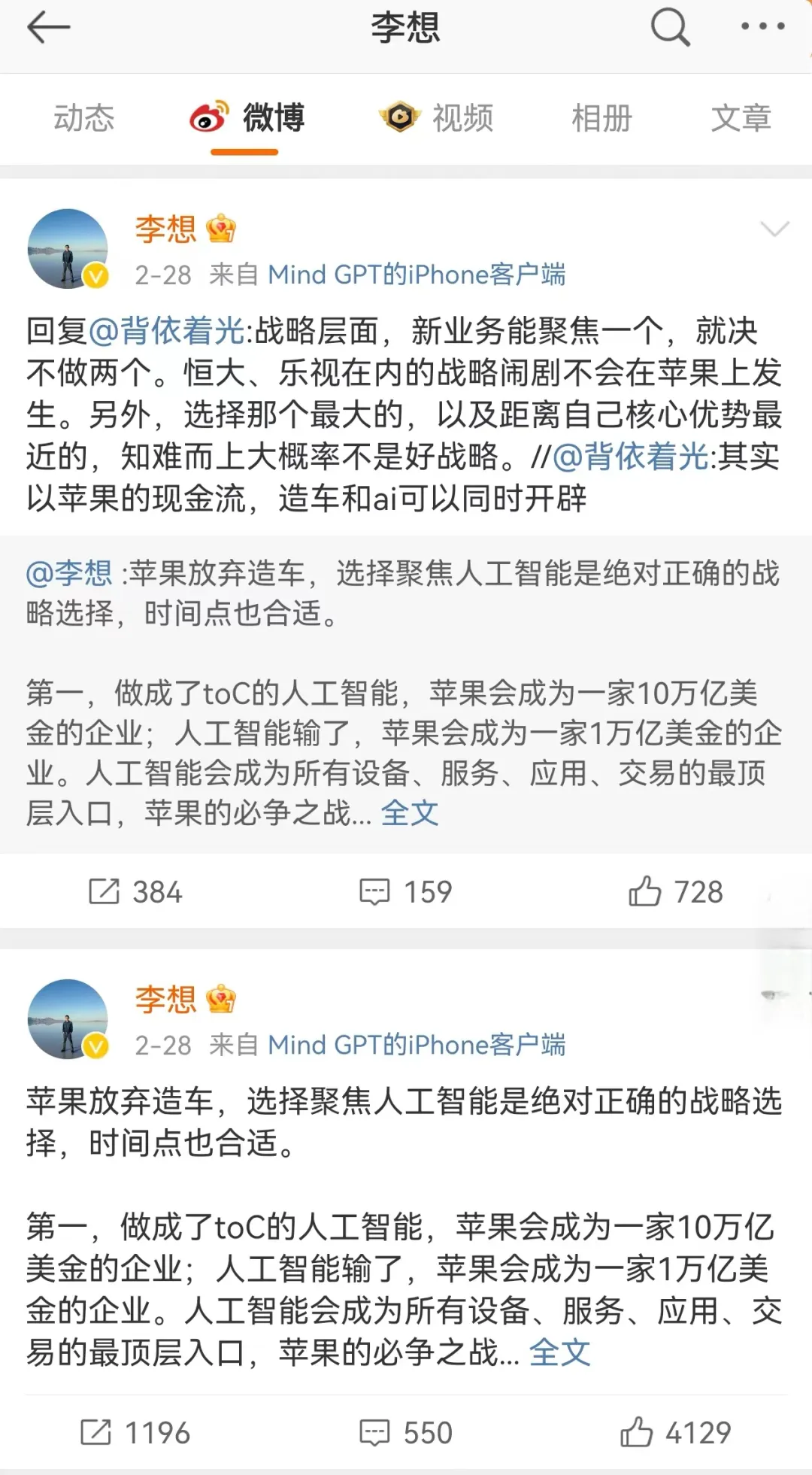 李想到目前為止仍然沒有開通短視頻賬號,他依然以微博作為主要運營方向。