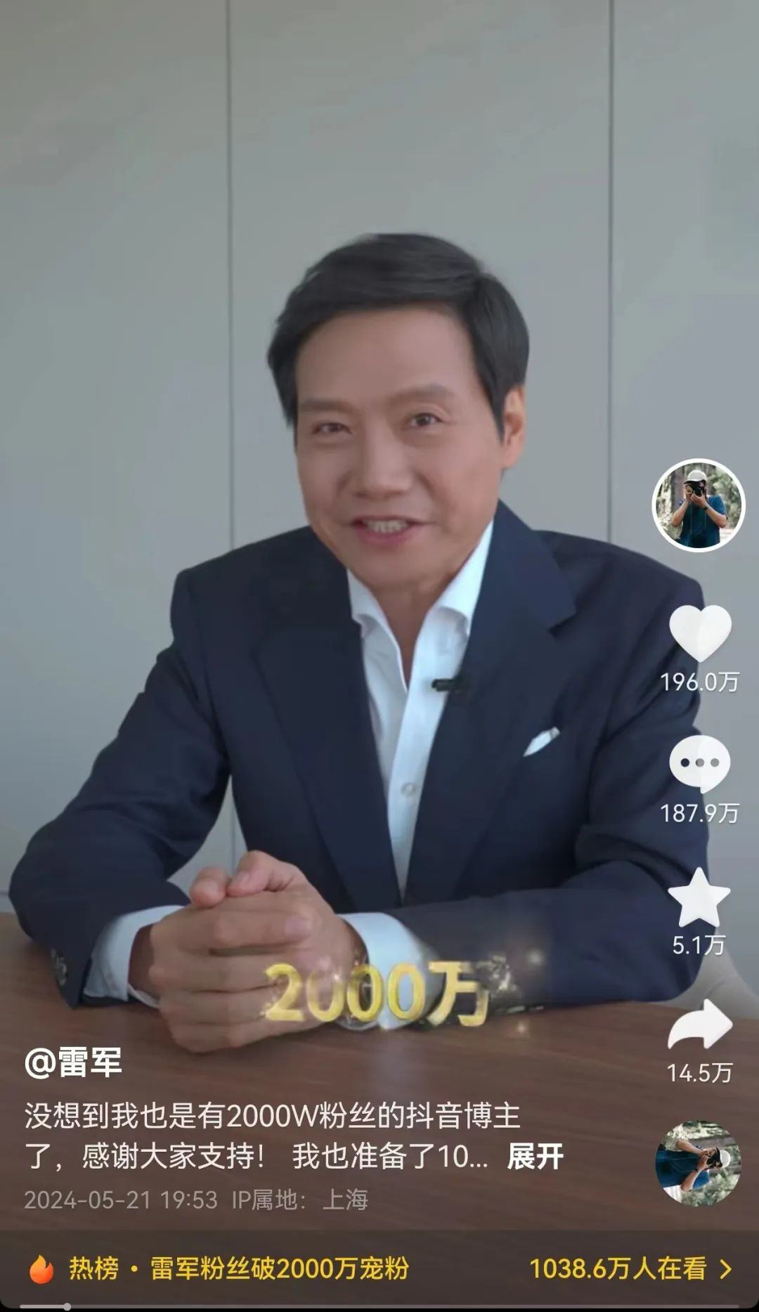 前幾天,雷軍發短視頻稱自己也是2000萬粉絲的抖音博主了。