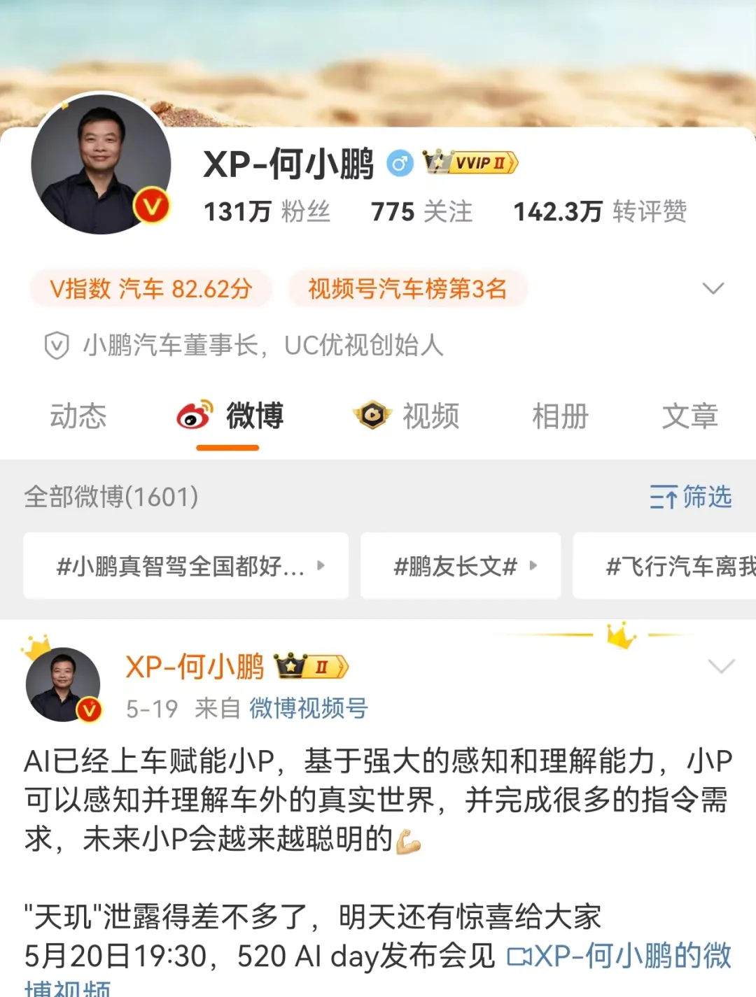 何小鵬還是更注重微博平台,截止目前其微博粉絲131萬,獲142.3萬轉評贊。他的微博目前基本保持日更,主要內容還是比較嚴肅的企業品牌宣傳,偶爾有一些日常工作生活記錄。