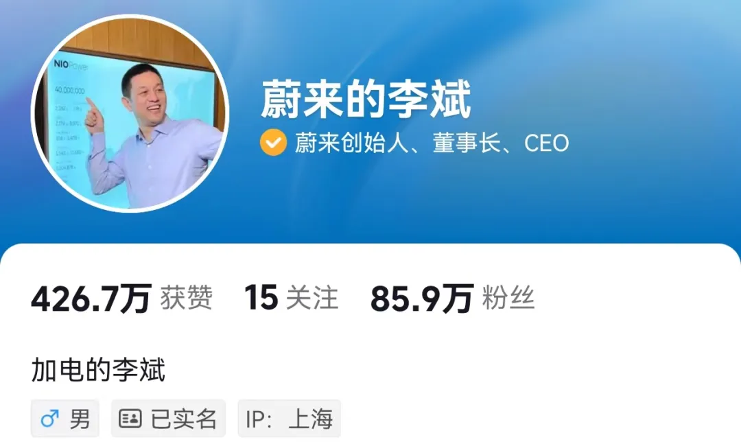 目前,雷軍微博粉絲2384.6萬,抖音粉絲2290萬;李斌微博粉絲59.1萬,抖音粉絲85.8萬;何小鵬微博粉絲131萬,抖音賬號40萬;哪吒張勇微博粉絲33.5萬,抖音賬號粉絲28.6萬;魏建軍微博粉絲25.5萬,抖音粉絲46.8萬。