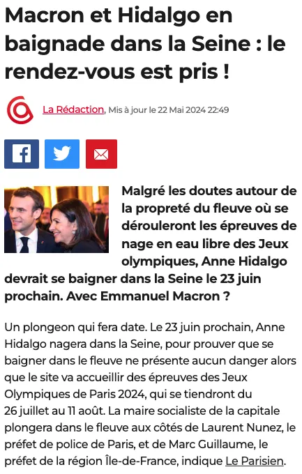 同時無論如何,需要獲得地區行政長官的命令才能批准這次“下水”,因為“目前塞納河仍然禁止游泳”。