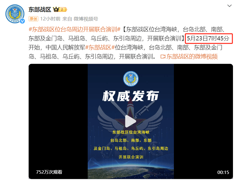 5月23日7時45分,東部戰區宣佈,解放軍會在台島北部、南部,東部及金門島、馬祖島、烏丘嶼、東引島周邊,開展名為“聯合利劍-2024A”的大規模聯合演訓,演習時間從5月23日持續到24日。