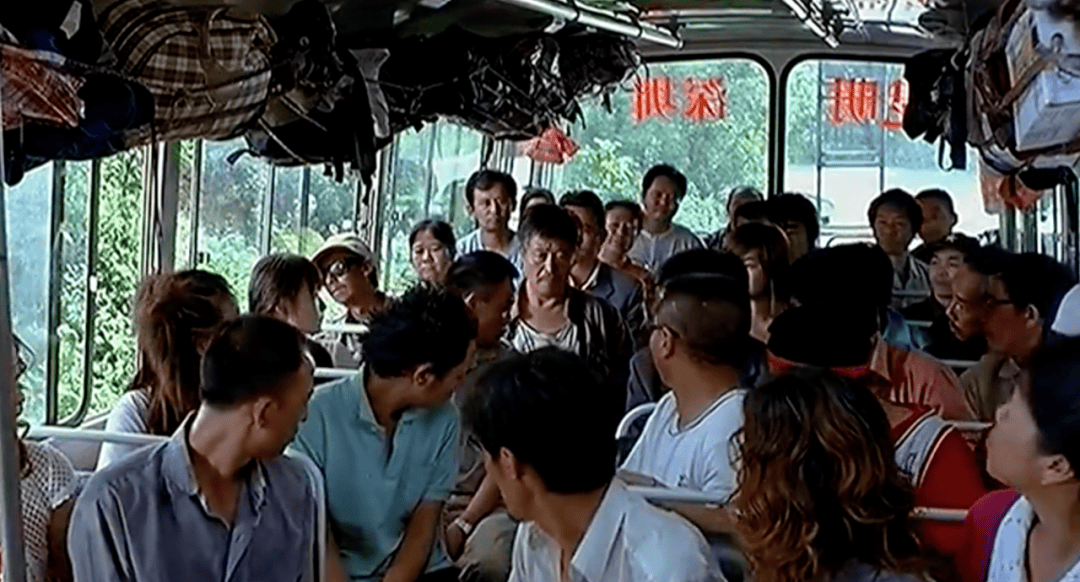 劫匪老大(郭德綱 飾)手裏拿着刀,威脅車上的乘客掏錢。