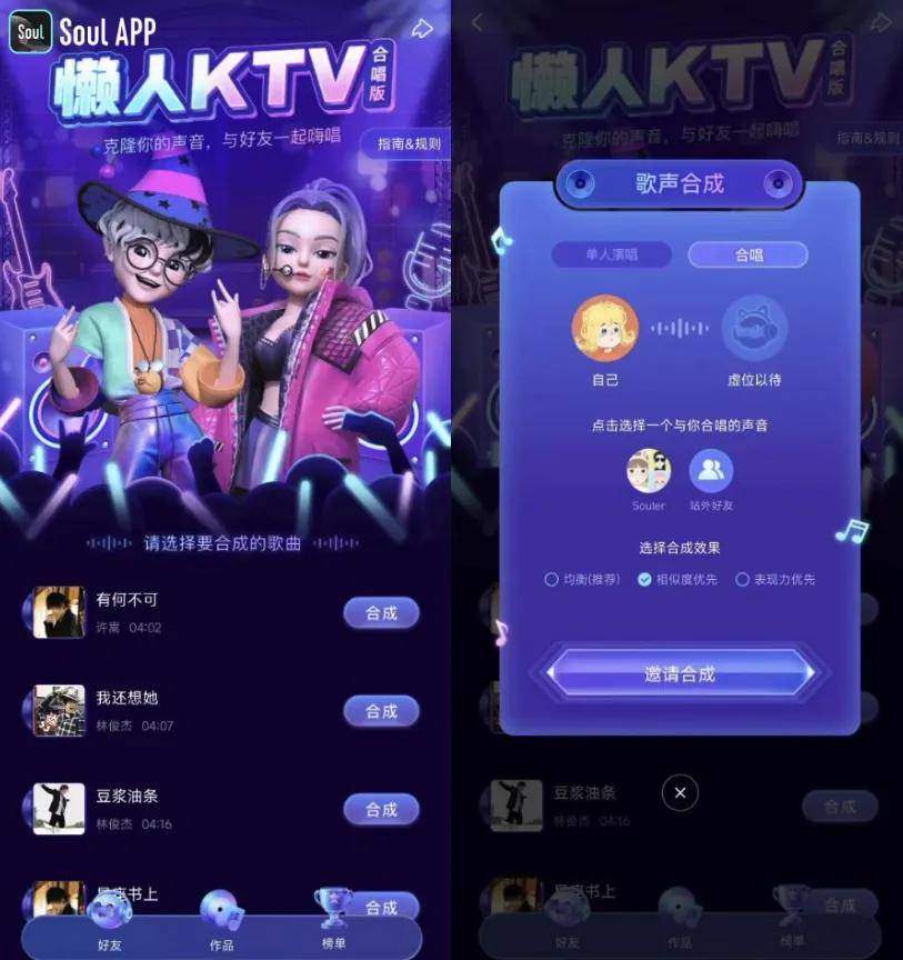 在Soul,不僅有3D捏臉,還有伶倫、懶人KTV等豐富多元的前台社交生態,可以全方位地展現個性態度。