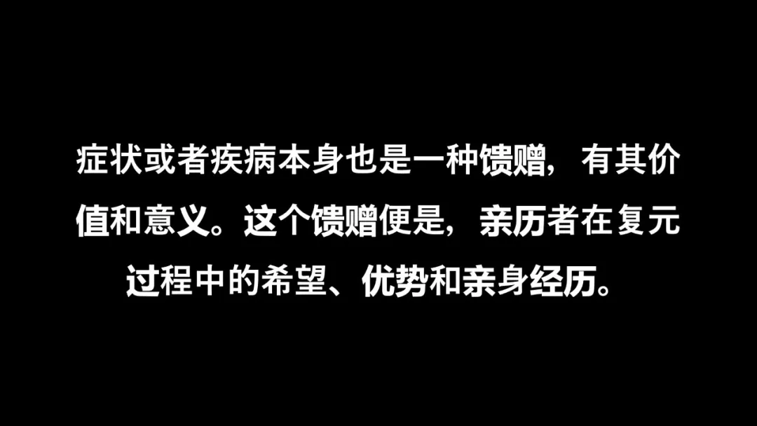 但是精神症狀的這樣的一個痊癒,恢復到正常,對於精神障礙的親歷者而言,真的是最重要的嗎?實際上我們再也沒有辦法回到沒有生過病的自己,不是嗎?如果我們把精神疾病心理困擾當成一個一個的問題去攻克去解決,那麼親歷者和他們的家庭也就很難從這樣的一個心理的困苦當中走出來。他們常常會內疚自責或者互相埋怨。