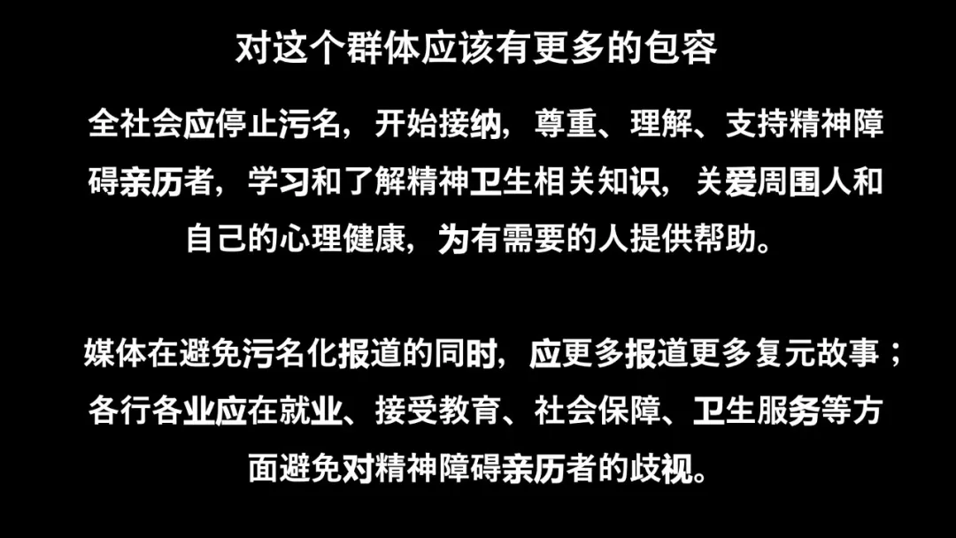 所以我在想,很多時候可能治好疾病,治好精神疾病只是我們的期待。這種期待的背後,它隱藏着我們對於精神疾病的否定。我們希望它消失,希望它不再存在,不要出現在我們的生活裏。但是往往讓親歷者的生活變得更好的不是這種期待和否定,而是接納、理解和包容。