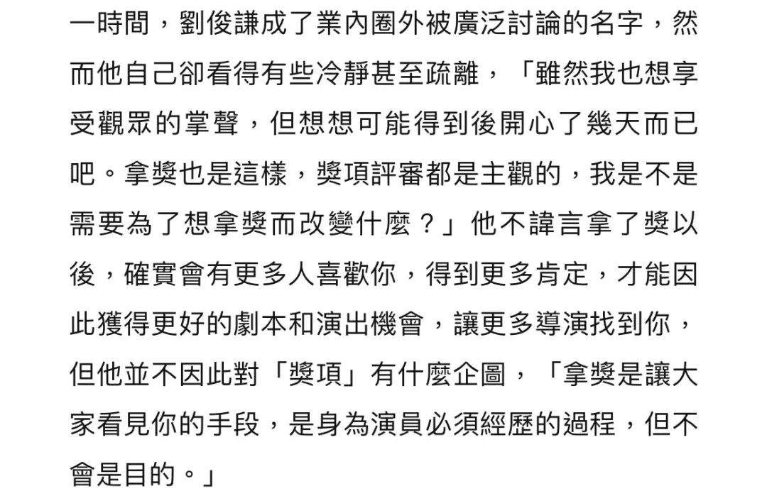 劉俊謙對於獲獎的態度也十分冷靜客觀。