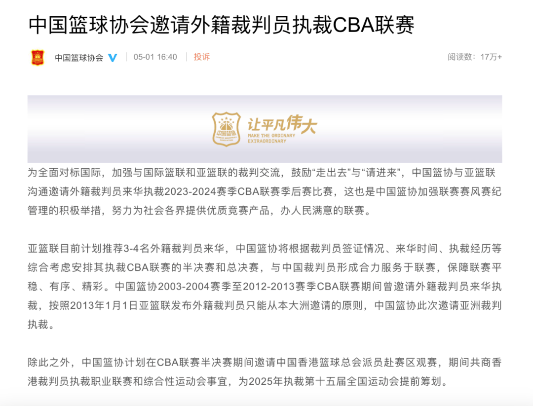 5月1日,中國籃球協會發文稱將邀請外籍裁判執裁