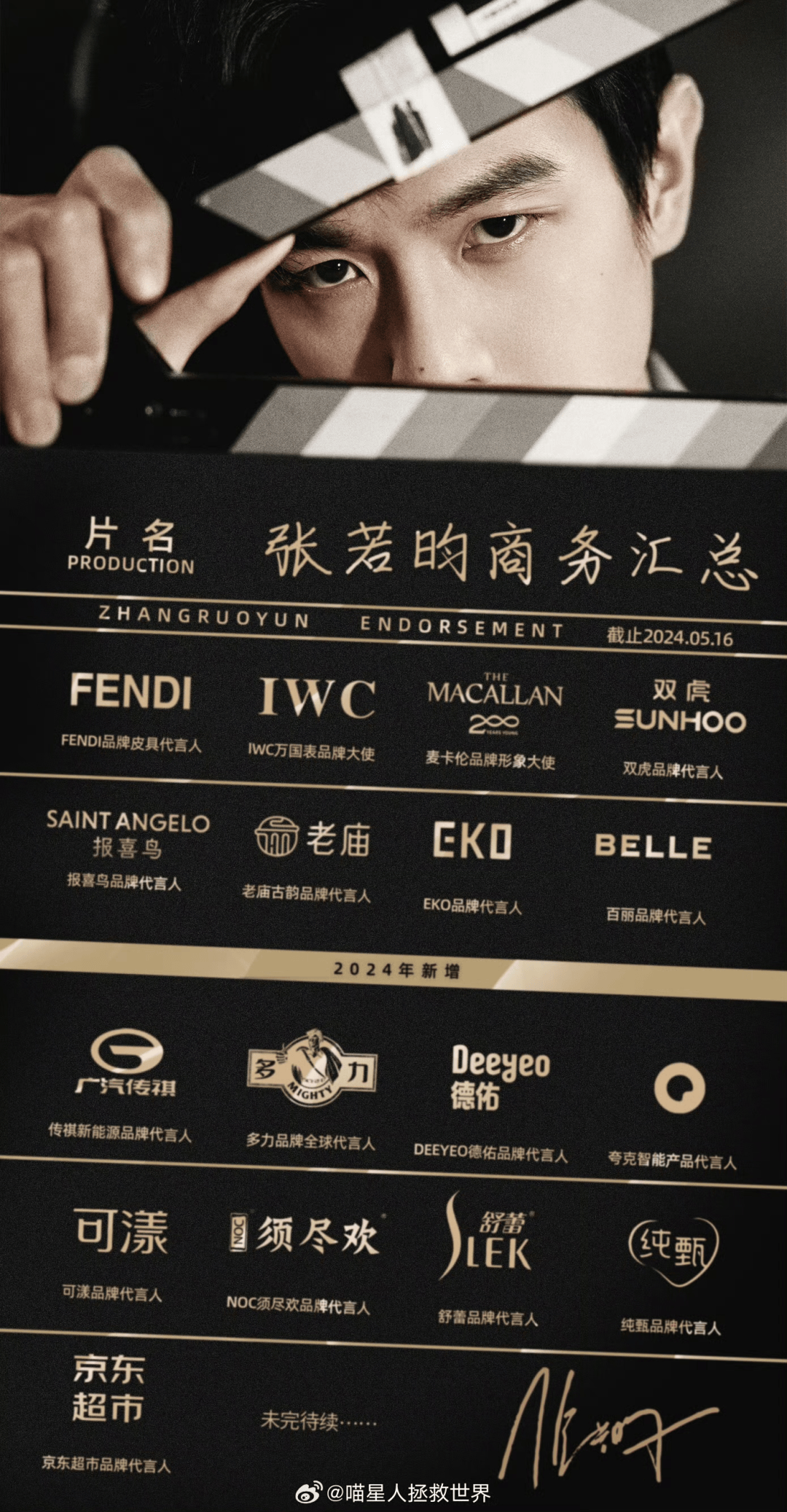 **其次,演員與現象級大劇的互相成就,可遇而不可求,但穩定的有效播劇能力才是演員最核心的市場信任度和商業價值。**在多品牌選擇張若昀為代言人的新聞中,亦能看到品牌對其“選品”能力以及持續輸出優質內容的能力的高度認可。而張若昀版“範閒”的深入人心、他在春晚上“重温”小范大人的名場面,也都為品牌注入了強心劑,不斷增強品牌提前下注的信心。