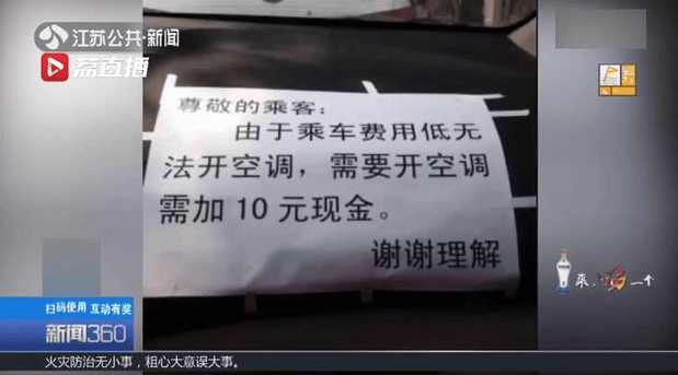 更折磨人的是,哪怕是酷暑,一些司機載客時也不開空調,還在車內張貼告示:“由於乘車費用低無法開空調,需要開空調需加10元現金。”