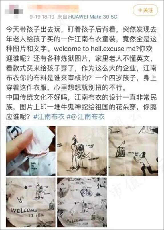 2021年9月,一個網友曬出的江南布衣童裝圖片,上面有“Welcome to the hell”(歡迎來到地獄)“Let me touch you”(讓我摸摸你)等英文字樣,以及西方宗教體系中撒旦、 獻祭、車裂酷刑等設計元素。