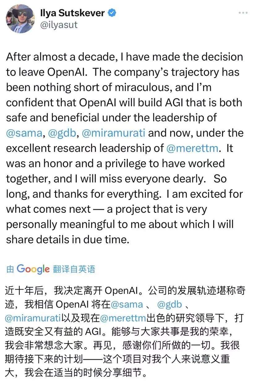 發佈會結束沒兩天, OpenAI 的首席科學家 Ilya Sutskever ,在推特上宣佈了自己離職的消息。