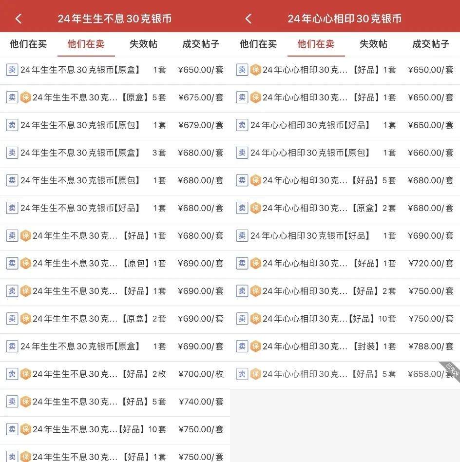 5月24日,時代財經在某錢幣交易app看到,相對較受歡迎的生生不息30克銀幣(發行價620元)的交易最低價為650元,心心相印30克銀幣(發行價620元)的交易最低價也為650元,溢價並不高。