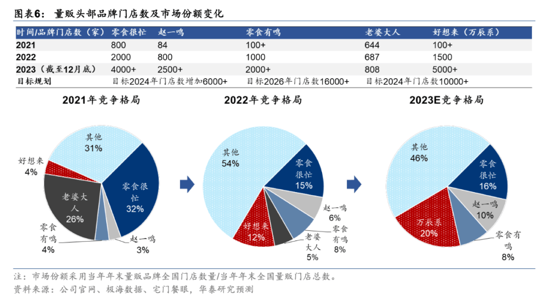 艾媒諮詢數據顯示,截至2023年10月,全國零食折扣門店數達到了2.2萬家,全年市場規模預計809億,比三年前增長了10多倍。華泰證券在一份研報中也指出,2021年時,中國量販門店的滲透率還只有4%,但2023年這個數字已經抬升到了39%。